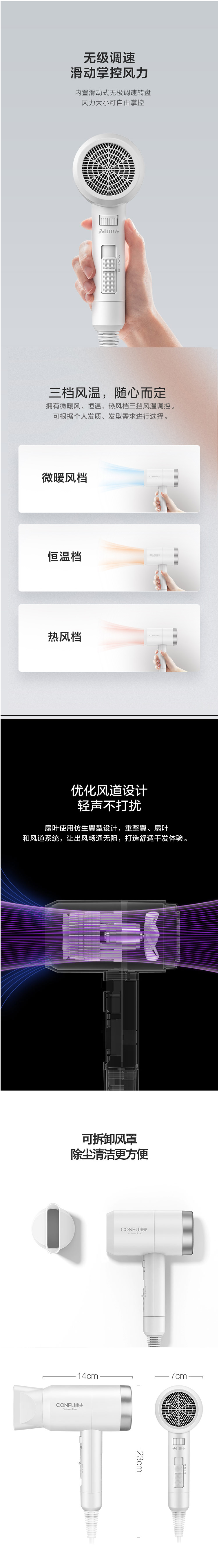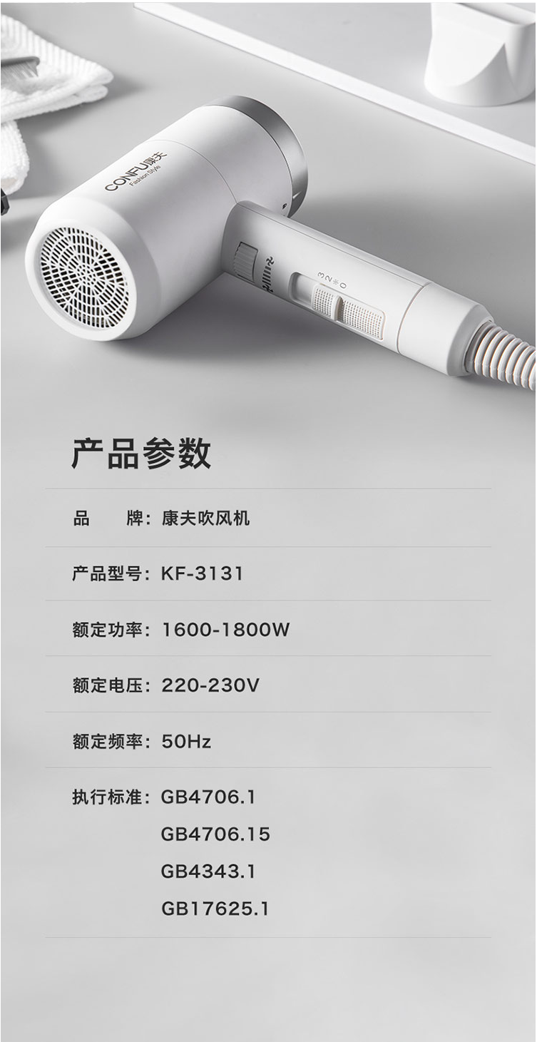 康夫(CONFU)KF-3131电吹风机家用水润负离子润发低辐射护发恒温速干电吹风筒白 自营